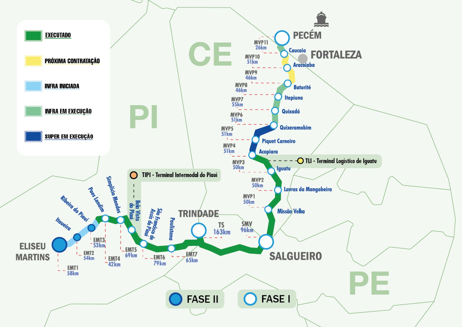 De acordo com a TSLA (Transnordestina Logística S.A), a fase 1 será finalizada em 2027, conectando a ferrovia com o Porto de Pecém (CE). E o trecho de 151 km, que passa por Eliseu Martins e Paes Landim, no Piauí, será retomado no início do ano que vem e a previsão de conclusão é para 2028, um ano e meio antes do previsto.